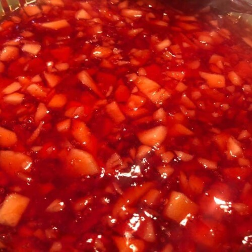 The key to making this salad turn out right is to keep stirring it until the apples settle to the bottom and all around instead of just floating on the top. You’ll need to stir it every 15-30 minutes until it is set. I can still see the large serving spoons on the kitchen counter next to the refrigerator – one stained red and one stained yellow. They were used separately for the jello salads when Mama stirred them to make sure the apples settled where they belonged.