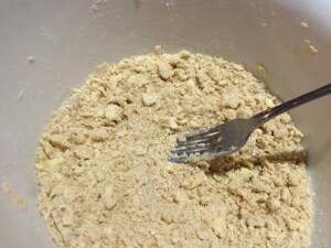 Mix your sugar and flour together, then slice the butter into small sections. Add the butter to the sugar/flour mixture. “Cut” the butter into the sugar/flour mixture until it is crumbly, like this: