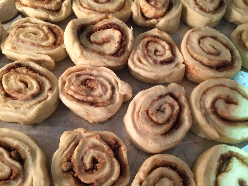So today I’m standing in my kitchen, alone, slicing across the rolled up cinnamon bun to make practically even rolls. I put the rolls into a large pan – large enough to hold an even 48, and let them rise for about an hour. One of the keys to making cinnamon rolls is to not over-bake them. If the center pops up in any of the rolls, just reach in and smush it back down where it belongs.