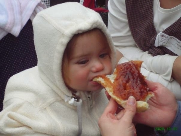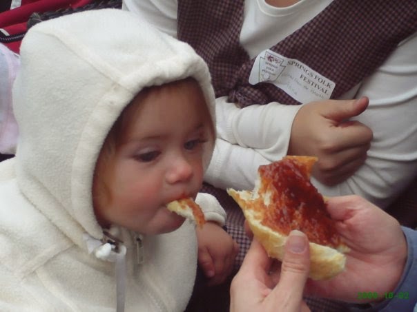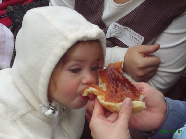Training ’em young: Rebecca Miller from Nebraska (4th generation) savors each bite.