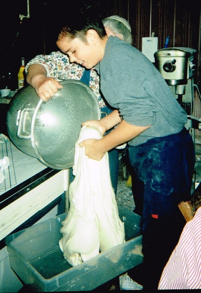 Katharine (now in her late seventies) begins mixing bread at midnight and stays until the sun is up and more help has arrived. We consider her the unofficial expert, and she finds ways to fix mistakes during the batch-mixing like nobody else can.