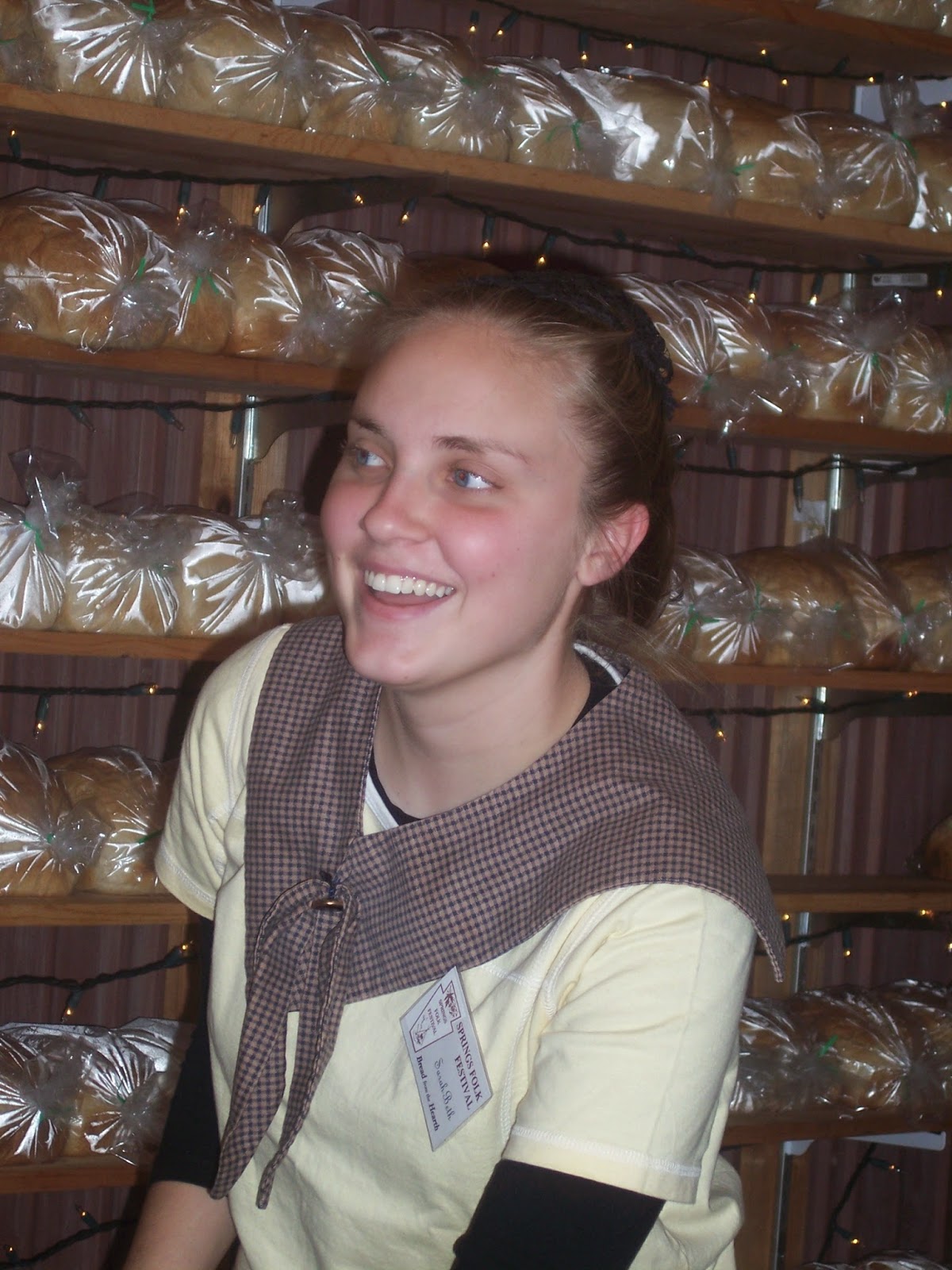 Rachel and Alice hold responsibility for the Bread from the Hearth booth. Alice and her husband Bernard arrive in the middle of the night, in time to put the first loaves into the oven (which has been fired since before midnight), and stay for the remainder of the day.