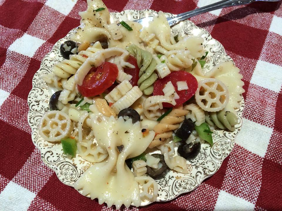 So there you have it. Grab your choice of pasta and cook it per directions. Then add peppers, chives, onions, olives, tomatoes, and anything else you’d like to serve. Toss it with the dressing and chill, and it’s ready to serve. Thanks, Marlene!
