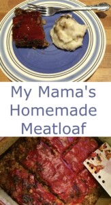 This photo shows homemade mashed potatoes with browned butter on the top. That was also one of my mama’s specialties. You can serve this with scalloped potatoes or with creamy, cheesy macaroni or with baked macaroni. I also like to serve this meatloaf with home fried potatoes.