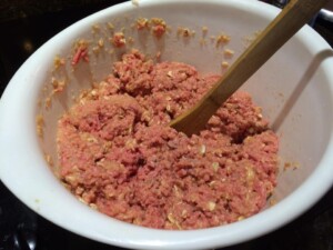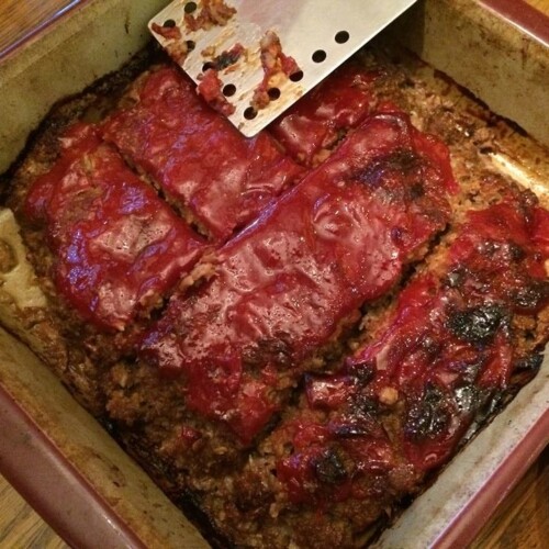 To make this recipe, you’ll need hamburger, milk, eggs, oatmeal, tomato juice, and crushed corn flakes. If you like onion or other seasonings, add them to suit your fancy. Just mix it all together and put it into a pan.