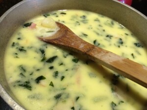 There’s something about the aroma of onion and garlic mingled with chicken and ham that speaks of comfort and home. I’ve never been a fan of spinach or kale, but this soup welcomes you to the table with a delightful flair, and you won’t even know the spinach is there! Mostly it will seem like a ham potato soup.